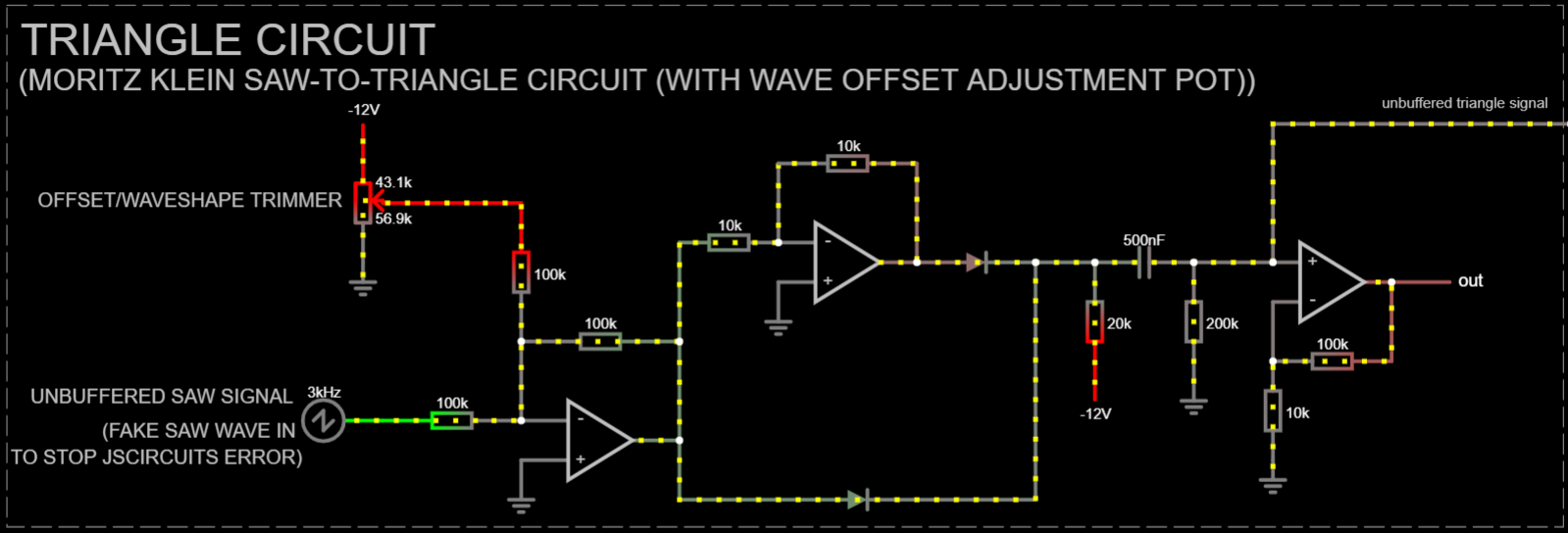 In addition, to the Saw and Square waves of the EDU VCO, I have added a Saw-to-Triangle conversion circuit which also came from a Moritz Klein Video. This circuit includes a wave offset trimming pot to tune your triangle to smooth melodic perfection.